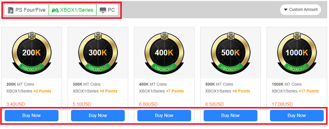 2. Elija su consola y la cantidad de monedas MT que necesita, luego haga clic en "Comprar ahora".
