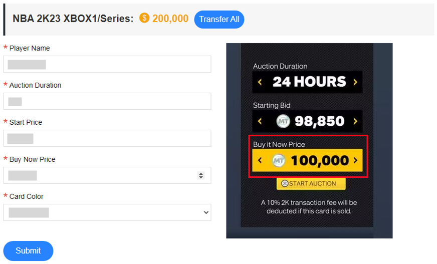 6. Subaste su propia tarjeta en el mercado de transferencias del juego, establezca la duración de la subasta en 24 horas, establezca el precio inicial como un número aleatorio y establezca el precio de compra inmediata en 100K. Complete la información del jugador en el formulario según sea necesario y haga clic en "Enviar".