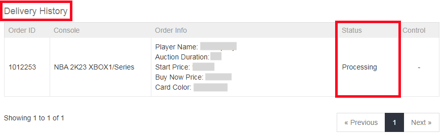 7. Verifique el estado de la orden de retiro en "Historial de entrega". Espere un momento hasta que compremos su tarjeta de jugador, luego inicie sesión para recoger sus monedas.